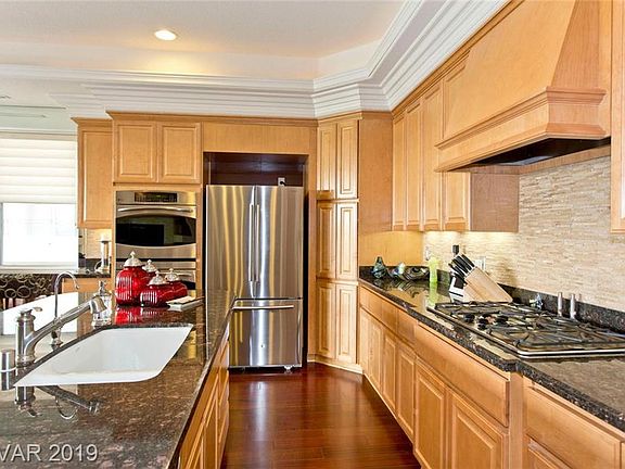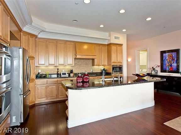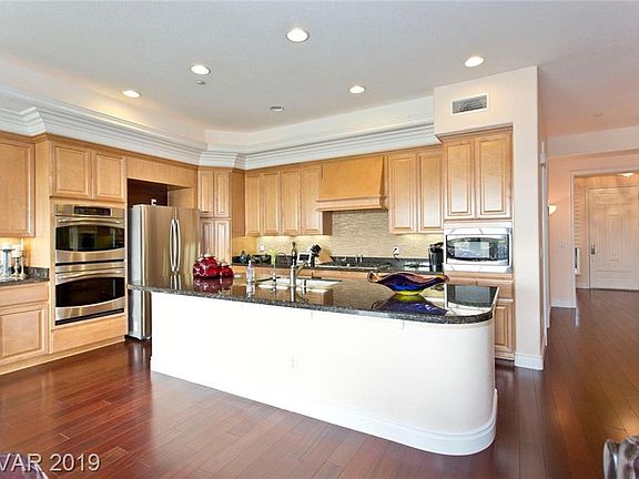 Gorgeous! Luxury! Elevator opens into unit w/FOB, overlooks Angel Park. Dual masters. 2 terraces, one is 550 sq ft with panoramic view of Strip, Angel Park, Red Rock, mountains. Cherry hardwood, gourmet kitchen, wall mirrors, crown moulding, coffered ceilings w/accent lighting, granite, roman shades. Firepl+ kitchen stone backsplash, ceiling fans, SS appl, sep laundry rm. H2O cond/RO. Pvt 2-car gar. Numerous pools, community clubhouse & exer fac.