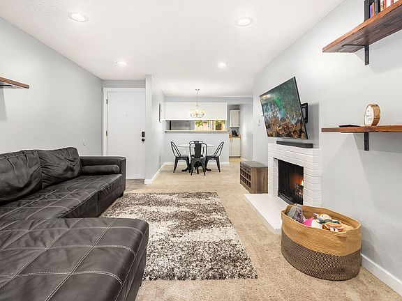 Vacation at home in this beautifully maintained end unit home. A Stylishly updated end unit lives like a single family home: New windows, Sliding Door, Roof and Private Balcony flooring. Attentive owners have thought of it all: Newer carpeting and both bathrooms completely updated and on trend. The large Living room with a fireplace flows onto a quiet, covered balcony. Plenty of room in the kitchen with a breakfast bar. Enjoy the Heated Pool, Sauna, Athletic Court. Welcome friends anytime with plenty of guest parking. Great location just minutes to shopping and major roads. No rental cap!