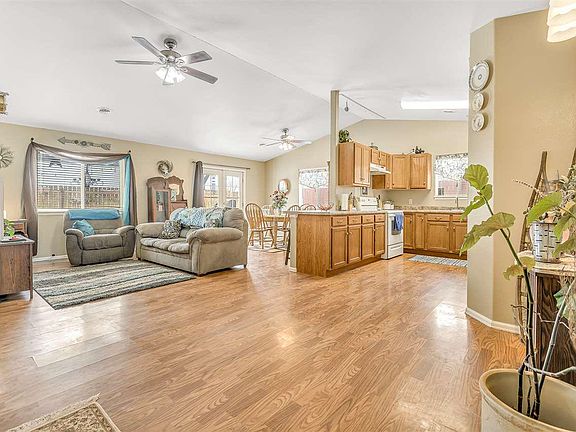 Immaculately-maintained and move-in ready, this ranch-style home presents an open-concept floor plan with generously-sized spaces throughout. Low-maintenance wood laminate flooring expands throughout the main living area. The kitchen offers a pantry along with a breakfast counter ideal for morning breakfasts or casual dinners. Vaulted ceilings and plant shelving highlight the bright living space, and French doors off the dining room lead out to the large entertainment patio and expansive backyard. The master suite situated at the back of the home boasts a walk-in closet and en-suite with a double-sink vanity, bathtub, and large linen closet. With two full bathrooms, central AC, a new roof, RV parking, and backyard views, this home is a must see!