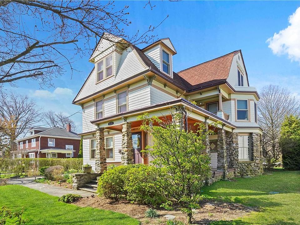 A rare “Queen Anne” style Victorian in Pelham, this historic home was built in 1879 as part of Pelham Manor's original "Chestnut Grove" development. Exquisite recent renovations are paired with extraordinary original details. Twin parlors and a formal dining room with high ceilings, mahogany newel post and banister, marble fireplace, a tin ceiling, and stained glass windows blend with a bright and happy kitchen, gut renovated (2021) and featuring custom cabinetry, quartz counters, high-end appliances, center island with seating, alcove breakfast area, laundry closet with full-size washer & dryer, mudroom and powder room. Second floor with three bedrooms and three baths, including a new (2019) luxurious, marble, spa-like master bath. Third floor rooms include two bedrooms, a full bath, sitting/office area and a large rec room with cathedral ceiling. Two-zone central AC system throughout all three floors. Restored front porch with native stone pillars, Douglas Fir flooring and Yellow Pine wainscot ceiling, plus a rear bluestone patio overlooking large, level lot with quaint original barn and hay loft. Located just steps from Prospect Hill School & Playground. Additional Information: Amenities:Marble Bath,Soaking Tub,HeatingFuel:Oil Above Ground,