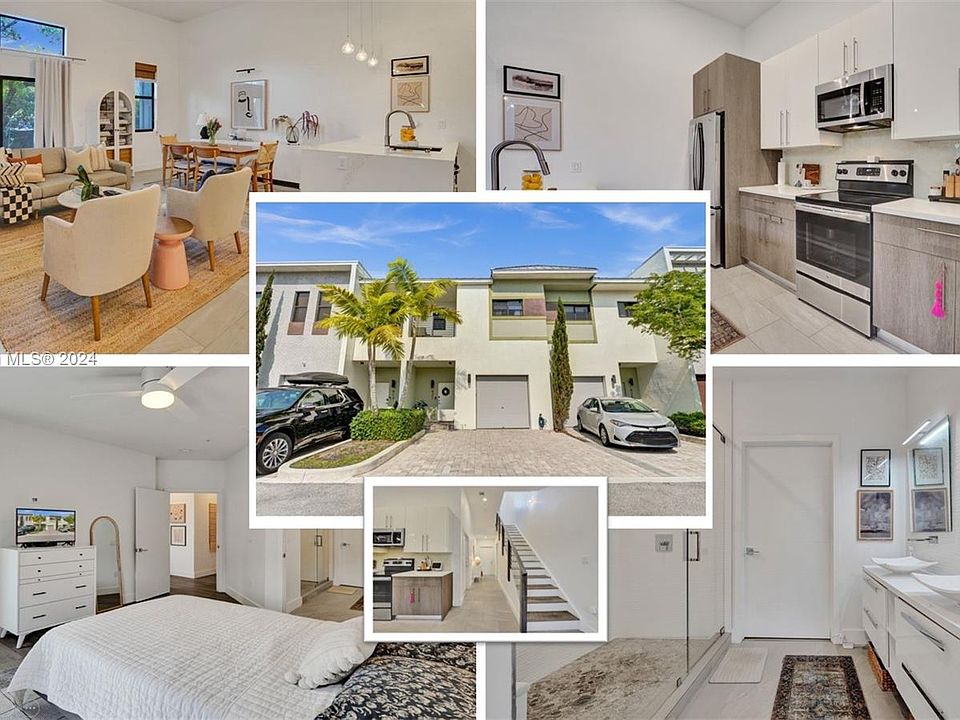Modern townhouse in gated community of Strata Plantation. 1616SF, 2-story, 3BR/2.5BA/1-car. Foyer entry leads to 12’ ceilings & open floorplan-seamlessly connects living area. Redesigned kitchen boasts European cabinets & new waterfall quartz countertop island. LR/FR opens to private patio. Contemporary staircase w/sleek metal details to upper level & new LVP floors. Serene owner's suite: veranda for outdoor enjoyment, walk-in closet & a spa-like bath w/double vessel sinks, LED vanity lights & frameless shower w/pebble mosaic floor. Impact windows & low HOA. Amenities: clubroom, gym, lounge, play areas, dog park, trails+. Easy access to Turnpike/441/I-95 Don’t miss the opportunity to own this exquisite townhouse that perfectly blends modern design with functional living. No rental 1st year