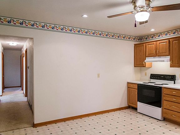 This wonderful brick ranch home is located at the end of cul-de-sac on NE edge of town. Enjoy the oversized backyard and covered patio. Hardwood floors in bedrooms are beautiful. Original hardwood floors under carpet in hallway and living room. Living room features large picture window for lot of sunshine and built in hutch. For more space, there is a full finished basement with an extra room (no egress) could be a bedroom. Large eat in kitchen. Large 1 car garage with newer motor/tracks and sensors. New water heater 2025.
