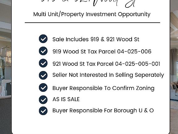 THIS SALE INCLUDES TWO TAX PARCELS- 919 AND 921 WOOD STREET. TAX PARCELS 04-025-006 and 04-025-005-001. 921 Wood St is a triplex. 3 separate rented units. Front downstairs unit-1 bedroom 1 bath, $650 mtm. Rear downstairs unit-1 bedroom 1 bathroom $600 mtm. Middle upstairs unit- 2 bedroom 1 bathroom $1,000 mtm. 919 Wood St is currently 2 dwellings-no leases, zoned single family. Downstairs dwelling offers 2 bedrooms and 2 full bathrooms, wood burning & gas fireplaces! Upstairs dwelling offers 3 bedrooms and 1 bathroom. Garage in back of lot is not included in sale. Buyer responsible to confirm all zoning and requirements. Property being sold AS IS & Buyer responsible for U & O.