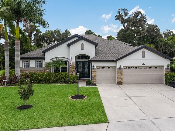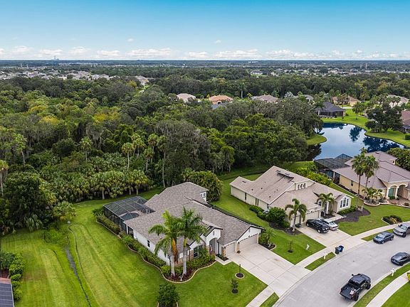 Peaceful preserve views abound from this 4 bedroom + office/den + bonus room home. This sophisticated residence exceeds expectations inside and out. The essence of urbane elegance is experienced throughout with tray ceilings, updated finishes, and stately pillars. A flowing floorplan effortlessly highlights the beautiful, natural Florida green space behind this home. Just off from the striking foyer, the detailed flourishes of elevated ceilings and picture frame molding in the formal living area overlook the sophisticated, shiplap-accented formal dining room. Welcoming you into the heart of this versatile home, an open-concept kitchen and living room area encourages togetherness. Designed to inspire culinary creativity a large island, newer wood cabinetry, glossy granite counters, and stainless-steel appliances highlight the updated kitchen. Equipped with a built-in surround sound system, the family-friendly living room is designed with entertaining needs in mind while displaying refreshing pool and preserve views through sliders leading to the screened lanai. The whole family can spend the day relaxing in the pool, soothed by the sounds of the three water features and immersed in lush, tranquil privacy the preserve backdrop provides. Retreat from the oasis outside via sliders to the custom upgrade ensconced master bedroom and spa-like en-suite bathroom equipped with garden tub, large walk-in shower, and dual vanities. The spacious study/office is situated towards the front of the house with three quality-sized guest bedrooms and generously sized, versatile bonus room conveniently positioned away from the master suite. The 3-car garage has extra storage as the original kitchen cabinets are now installed there. The exterior features brand new solar panels to reduce your utility bill, a newly fenced area for your pets, and is beautifully landscaped and lovingly maintained with creative edge landscape curbing and mature trees and shrubs. Located in the exceptional and convenient Ancient Oaks, this residence is near the most desirable shopping, dining, and beach locations the Suncoast has to offer.