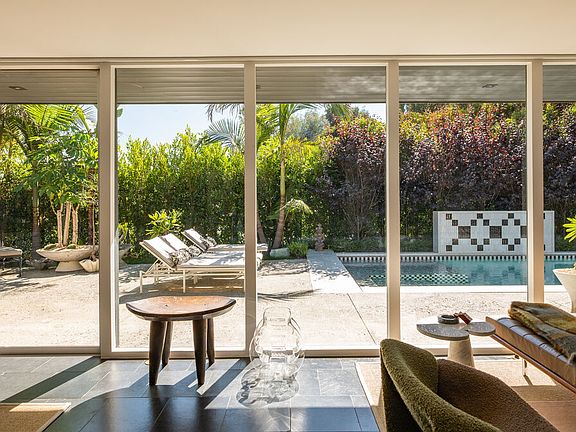 THE ULTIMATE BESPOKE BIRD STREETS JEWEL BOX. This sleek mid-century set behind gates and incredibly private, exudes elevated design at every turn. Inside, you'll find a superb floor plan separating the private quarters from principal spaces, creating ideal flow and functionality. The interiors are bathed in natural light, with floor-to-ceiling glass framing lush greenery outside while providing perfect walls for art inside. Black slate floors anchor the main living areas, while the living room features a striking stone clad fireplace. The gourmet galley kitchen features custom white oak cabinetry with brass mesh inserts, honed marble countertops, and exquisite detailing with top-line appliances and generous counter space. Every bathroom has been completely remodeled down to the studs with timeless materials and elegant finishes. The primary bath showcases travertine floors and walls, quartz countertops, and custom white oak wood paneling. The middle guest bath features a full travertine design with quartz counters and a tempered ribbed glass shower enclosure. A newly added guest powder room dazzles with black marble floors, Fornasetti designer wallpaper, and a one-piece Viola marble sink. The third bedroom features an ensuite bath adorned with oxblood and lavender marble finishes, burnished gold tile, and a relaxing sauna for the ultimate spa experience. Refined details abound throughout: most fixtures are unlacquered brass designed to develop natural patina over time, brass switch plates accent bathrooms and kitchen, and all lighting is dimmable. Quartz flooring adds durability to bathrooms and the newly added section. Outdoors, the home's mid-century architecture continues to shine. The completely redone pool features a new jacuzzi, waterfall feature, and automatic cover serving as the centerpiece of this tranquil retreat. Professionally designed landscaping and mature plantings create a seamless indoor-outdoor connection. Multiple sitting areas invite both quiet reflection and stylish entertainment, while a secluded outdoor shower adds resort luxury. Perimeter walls surround the driveway, with a security gate and LED strip lighting. The home can also be purchased fully furnished for an additional $200,000. By appointment only.