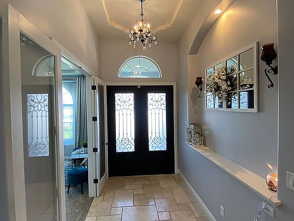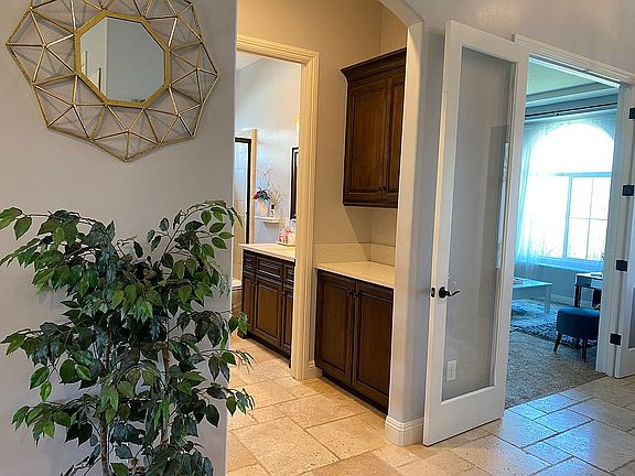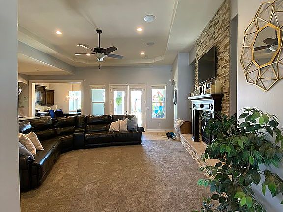 Semi custom home with 3 bedroom, plus 4th used as a game-room with dry bar and 3 full baths. Formal Dining room, currently used as an office. Breakfast nook and coffee bar with cabinetry. Ample storage in kitchen and walk in pantry. Two living rooms, split wing floor plan. Covered 315 sq ft patio with recessed lighting, TV hookups and ceiling fan. Upgraded memory foam padding under carpet and travertine floors and showers. Access to backyard through French doors in game-room and living room, single door access through main bedroom. 2 AC units, tank-less water heater, solar panels. Extended patio and RV/Toy Parking. Hot Tub Hook Ups. 3 car finished garage with extra recessed lighting. 6' concrete walls and 2 wrought iron gates. Custom wrought iron front doors. Tray ceilings in entry, living room, and main bedroom. In-ceiling surround sound speakers in the living room and surround sound wiring in the game room. Plans for a playground in the empty lot across the street.