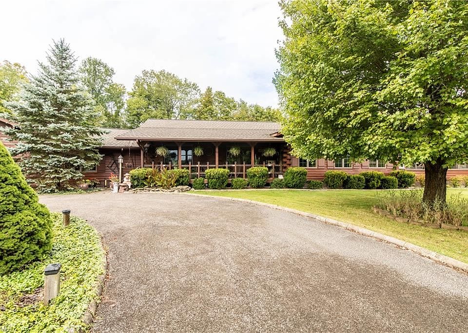 Ranch living at its finest! This flat log home combines rustic charm with practical amenities along with a fabulous piece of property - just over seven acres. The natural colored wood throughout the interior, including floors, is warm and inviting. A welcoming front porch leads to front entry. Living room with large wood burning fireplace can heat the entire home if desired. Three bedrooms and two full baths on first with a spacious kitchen and eating area, two pantries. Separate dining area. Office/work space off kitchen. Large laundry room. Solarium next to family room can be used many ways. Unfinished walk out lower level full basement with high ceilings has another full bath along with a wood burning stove that can be used to heat the entire lower level! Oversize garage has six bays that can be used many ways, but eliminates the need for a barn. There is a back drive with a covered space for parking a tractor. Six foot fence around garden and double dog pen on property. Perimeter is bordered with a split rail fence. Electric ice cables on roof, central vac. Great opportunity for the buyer who is looking for privacy along with some property. West Geauga schools.