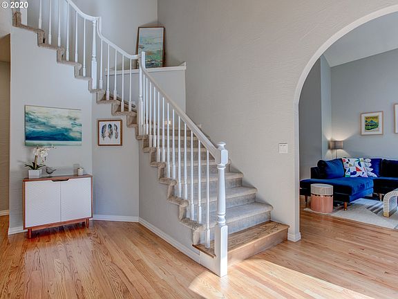 Stunning light and bright home with chic fixtures and finishes! This home has it all; newly refinished hardwood floors on the main; great room floor plan with gourmet kitchen, subway backsplash, pantry & gas range island; built-in entertainment area and fireplace; walk out to coveted large flat backyard. One bedroom on the main, upstairs has two more bedrooms & primary suite with fireplace, balcony, jetted tub/shower/water closet, a true oasis! New roof & steps away to shops, park and school. [Home Energy Score = 4. HES Report at https://rpt.greenbuildingregistry.com/hes/OR10187123.pdf]