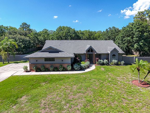 Imagine yourself enjoying a cup of coffee on the Expansive Deck, overlooking the pool, in your Private and Serene back yard oasis. Nestled atop an acre of mature landscaping, the deck and pool pad stretch the entire length of the home and connect to the large covered and screened-in lanai area that make it perfect for entertaining friends, grilling out on the deck, or unwinding and enjoying the sunset after a day at the beach. The home features vaulted ceilings, tile throughout the main living area, as well as an upgraded kitchen with solid wood cabinets, granite counter tops, and stainless steel appliances. The Great Room showcases the wood burning fireplace and breakfast nook that contains a several windows and doors that highlight the picturesque backyard. The spacious master suite features 2 oversized walk-in closets with plenty of room for storage as well as french doors that lead to the covered lanai. This home also contains a BRAND NEW hurricane rated garage door and motor in the air conditioned 2-car garage. Don't forget to bring your BOAT or RV, as there is ample parking in back yard through the 12 ft opening of the double swinging, metal frame gates. If LOCATION and VALUE are important to you, come and see this special property that is close to 'A' rated schools, nearby parks, shopping and dining, numerous golf courses, and the picture-perfect beaches of the Gulf Coast. Seller to include HOME WARRANTY with purchase. Septic tank was pumped, inspected and certified in 2018.