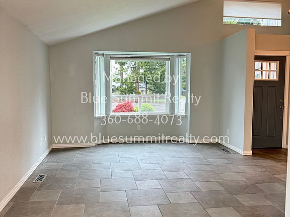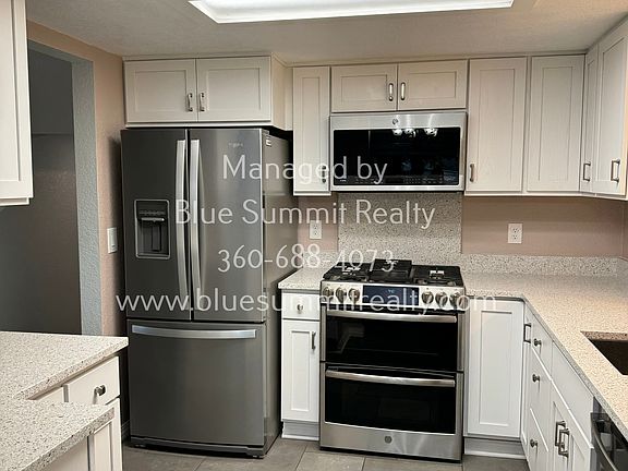 Charming 3-bedroom, 2.5-bathroom home with huge, beautifully kept yard! Open living and dining room off the kitchen with tile floors throughout the main floor. Kitchen features white cabinets and stainless-steel appliances. Entering from the 2-car attached garage, you have a spacious laundry room with laundry hookups (washer/dryer not included), a half bathroom, storage closet and sliding door to the covered patio. Fully fenced backyard offers an additional parking area, a storage shed, firepit, and so much space for playing and entertaining. Regular lawncare mowing/maintenance of the front and backyard is $100 monthly, separate from rent (tenant is responsible to water). Primary bedroom features an attached bathroom with walk in tile shower with bench. Small and medium dogs upon owner's approval - $250 onetime nonrefundable pet fee + $25 monthly pet rent per pet. No Cats. Close to all amenities and a quick commute to JBLM. Please visit our website for Blue Summit Realty and check out our Property Management- Learn More page to see our rental criteria. Contact our office with further questions and for a prescreening to potentially schedule a tour. We do not accept portable screening reports. Please contact our office for details.