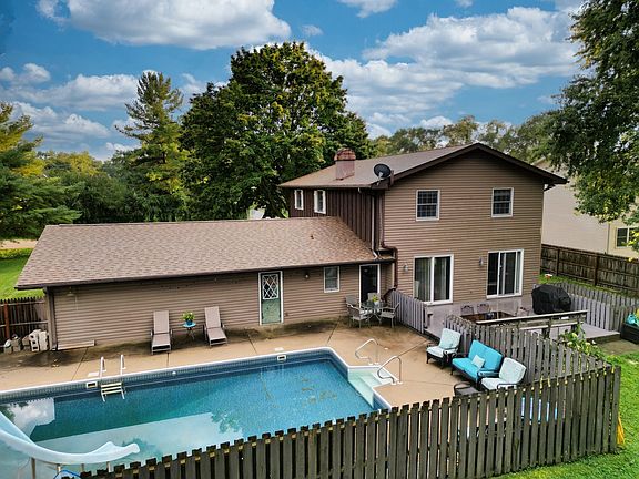 Simply stunning is this breathtaking custom brick and cedar four bedroom, three bath home located in the Westmoor Gardens Subdivision. This home has a total of 2494 square feet above grade plus another 755 square feet in the partially finished lower level!!! Before heading indoors take a walk around the heated 2.5-car garage and enter through the gate that will lead you to the spectacular "Party Paradise" backyard!!! Host your next pool party in the 8' deep 32' x 16' in-ground pool with diving board and slide!!! Your children and their friends will want to be here all summer long!!! There is an adjacent deck to sit and relax on or grill your favorites as you watch the outdoor festivities in the completely fenced in back yard. Add to your outdoor festivities the built-in horseshoe pits! Imagine all the unforgettable memories you, your family and friends will create here! 10' x 8' shed to house your outdoor games, pool equipment and lawnmower too! As you walk to the front of the home you notice the concrete side apron and immediately smile as visions of your boat and snowmobiles nestled on the pad come to life in your mind!!! Step inside the foyer and immediately feel the essence of being at home! Beautiful oak hardwood floors flow seamlessly through the foyer into the family room and into the kitchen. To the left of the foyer is the expansive living room with large picture windows allowing in an abundance of natural sunlight. Floor to ceiling brick gas log fireplace surrounded by wood built in shelving keeps you warm and cozy on those cool fall nights as you cuddle up together for a movie night or enjoy a relaxing night in front of the roaring fire. Adjacent dining room keeps you connected with others as you host Sunday dinners! Go to the right from the foyer and you enter the family room with natural wood beams adorning the ceiling and a natural stone floor to ceiling gas log fireplace. Your books, plants and treasures will have a home in the built-in shelving unit. Either side you choose to enter through from the foyer brings you to the heart of the home...the Kitchen! Images of prepping and cooking holiday treats and dinners come to mind as you survey the abundance of cabinets and countertop space, pantry, and the SS appliances!!! Sliding glass doors in the kitchen and family room lead you out the deck where you can also just relax with your morning cup of coffee and enjoy the brisk fall air. Main floor office/den for working from home or use as your home-schooling room is ideally located off the family room. First floor offers a remodeled full-sized bathroom...convenient for showering off after a day in the pool!!! Escape up to the second floor which offers more than enough room for everyone with four spacious bedrooms including the primary bedroom with remodeled ensuite. Relax in the tub or shower the day away in the stand-along shower with. Modern style separate vanities make morning routines less hectic! Other three bedrooms all generously sized with double closets and share a recently remodeled full-sized hall bathroom. Head downstairs to the newly carpeted recreation room for a night of movies or charades! Set up your pool table, ping pong table or arcade games in the game room...makes the perfect teen getaway area!!! Wait..one more room to go...perfect area for a sewing/craft room, exercise room or work shop...the possibilities are endless!!! Newer roof, fence, pool liner, pool heater, pool filter and diving board and wood siding on home repaired/stained this year means less maintenance and cost to you. Minutes away from Metra train station and Crystal Lakes main beach and all the festivities that happen here. It is said you can even see the 4th of July fireworks from the back yard while relaxing in the pool!!! Come and make this your next home...you will not be disappointed!!!