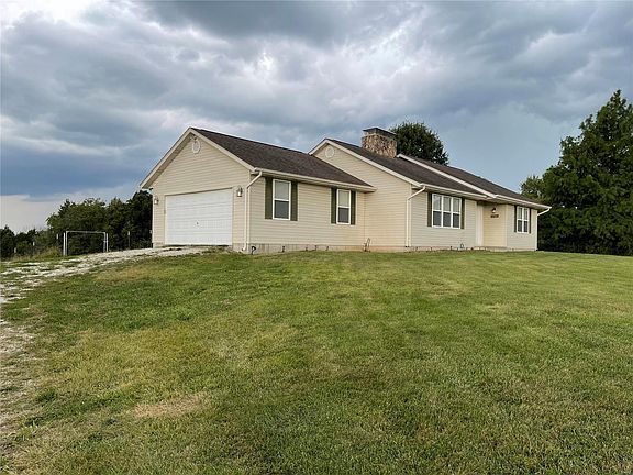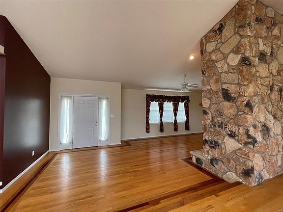 Attractive Atrium Ranch in a Country setting on 2 acres in Grandview School district. Open floor plan features vaulted ceilings and Solid oak hardwood floor throughout entry, living room, dining room, & kitchen. Floor to ceiling stone fireplace warms the living room. Nice kitchen w oak cabinetry and quartz countertop, appliances include refrigerator, range, dishwasher, and garbage disposal. Two bedrooms, and two full baths on main level include master bedroom suite w french doors to a full master bath complete w linen and walk in closet. Atrium oak staircase leads to unfinished full basement and walk out to large private patio w fenced yard backing to pasture/woods. Attached 2 car garage w garage door opener, provides convenient entry from garage into kitchen.