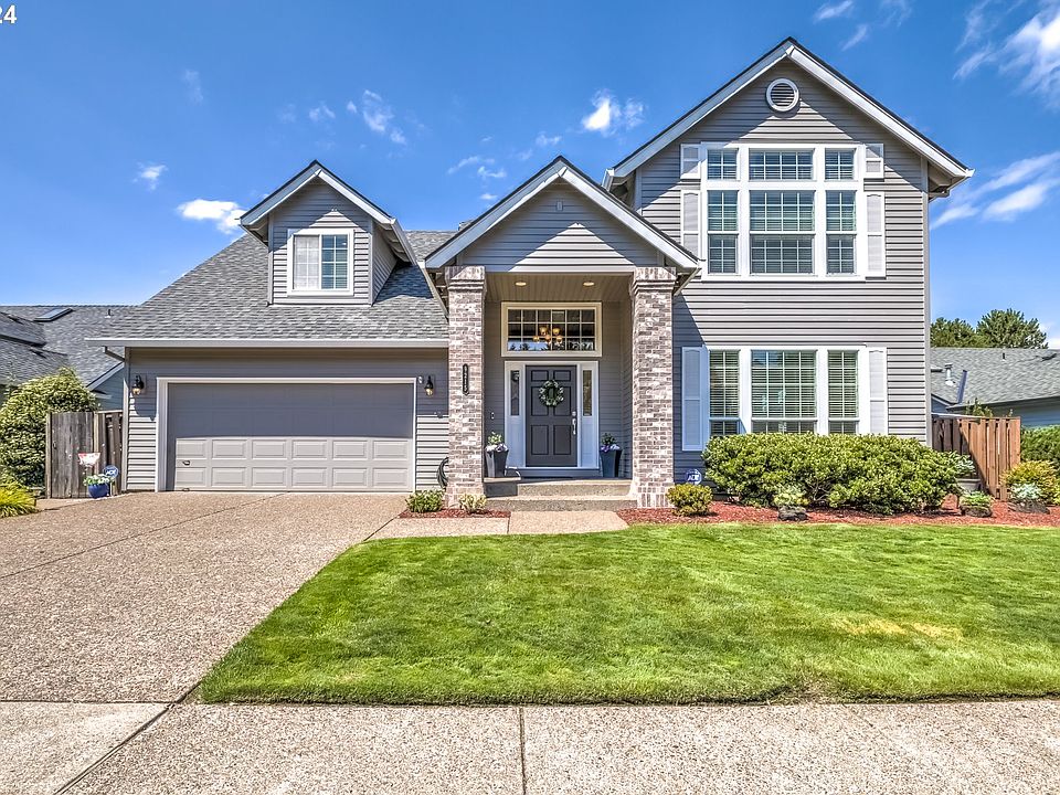3-bdrm + den/bonus home has been beautifully maintained by original owners. Den/bonus could be 4th bdrm. High ceilings, large windows & skylights make it feel larger than it is. Rooms are spacious. Family room has brick gas frplc & wall of windows. Kitchen features granite countertops, SS applcs, w-in pantry & dining nook. Vaulted primary suite has w-in closet & large bathroom w/jetted soaking tub. Upstairs utility room w/blt-ins & sink adds convenience. Fenced bkyrd features spacious patio w/large light-filtering cover, dog run & shed. Mahogany landing/deck from dining area to the bkyrd. Sprinkler system. Lots of storage. Cedar siding. Recent upgrades include new roof w/transfer. warranty (2023), gas furnace (2020), A/C (2020) & ext paint (2019). This home has excellent curb appeal & a welcoming entry. It provides comfortable, convenient living & is wonderful for entertaining inside & out. Located in desirable Byrom Elementary School District and has convenient access to I-5 & I-205.