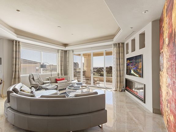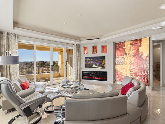 This stunning, fully furnished 2-bedroom condo is move-in ready and perfect for those seeking luxury living with breathtaking views. Located on the top floor of a 4 story lowrise w/private elevator access offering panoramic sights of Angel Park Golf Course, The Strip, and the mountains from its expansive terrace. The primary suite boasts a king-size bed, an office setup, and a spa-like ensuite bathroom, while the guest bedroom also features gorgeous golf course views. A state-of-the-art media room includes a 65" HD TV with surround sound for ultimate relaxation. Enjoy resort-style amenities, including a large swimming pool, three plunge/cocktail pools, two heated jetted tubs, a fully equipped gym, three outdoor barbecue areas, and a spacious cabana for entertaining. Available immediately for a 6-month rental, this condo is your opportunity to experience elevated living at its finest! Cleaning service is included in this rental as well as water and sewer, waste disposal and HOA 6 month minimum lease. Flexible after that. No smoking. No pets. $80 application fee per adult. Trash, water, sewer included. Monthly cleaning service included. $125 key deposit. $350 cleaning fee. Fully furnished.
