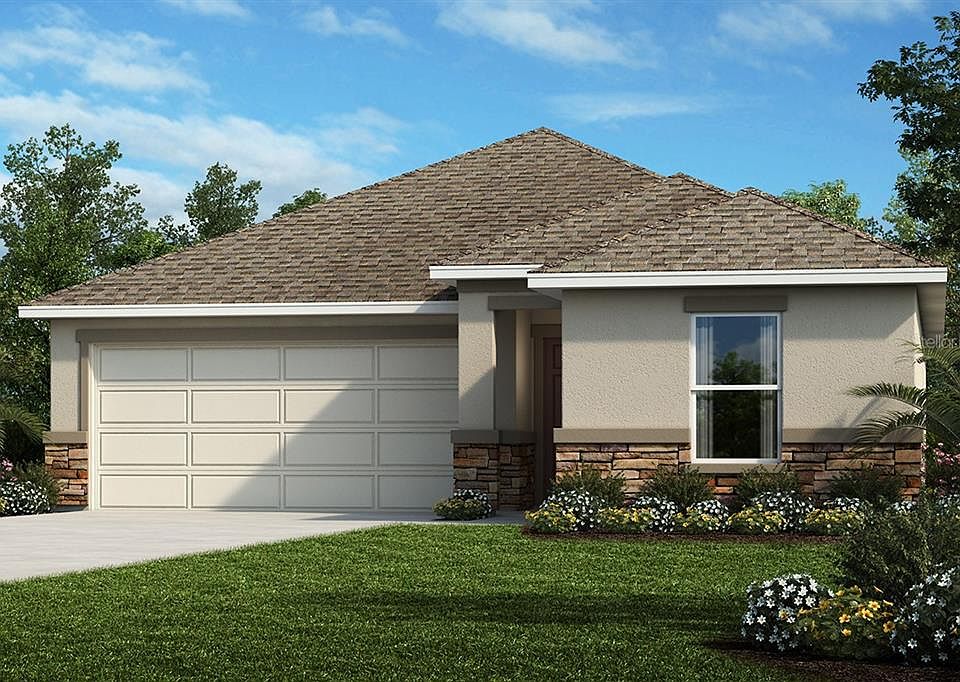 This stunning single-story home features an attractive stone exterior and an open floor plan with plank flooring. The spacious great room boasts high volume ceilings, creating an open atmosphere, while a dedicated laundry room offers convenient garage access. Upon entering, you'll find two secondary bedrooms with generous closets and a full bath that includes a walk-in shower. The heart of the home is the chef's kitchen, complete with an island, 36-inch upper cabinets, Silestone® countertops, a Moen® faucet, a Kohler® sink, and Whirlpool® stainless steel appliances. The primary suite serves as a relaxing retreat with a large walk-in closet and an ensuite bath featuring a dual-sink vanity and a walk-in shower with tile surround. Completing this home is a covered back patio, perfect for outdoor entertaining and leisure.