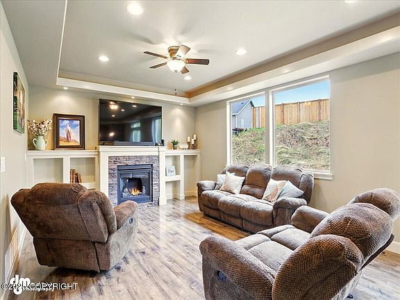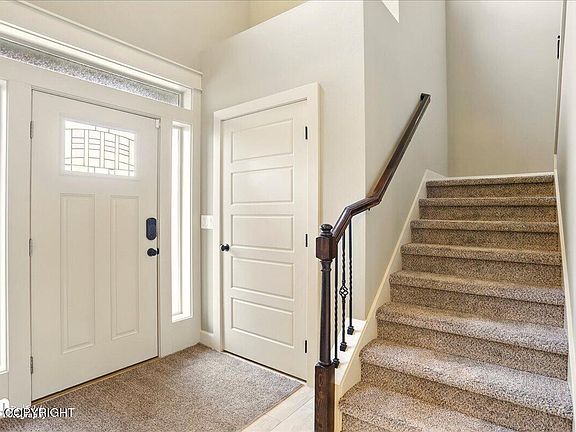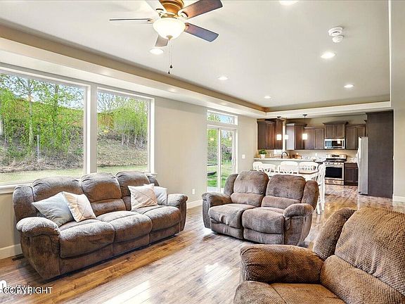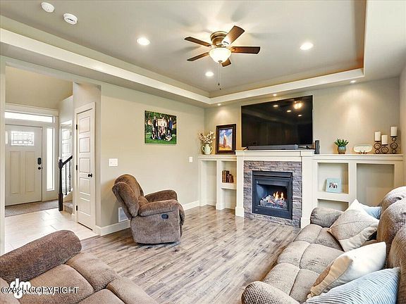 Fall in love with this sun-drenched and warm, welcoming home featuring an open floor plan, cozy gas fireplace, spacious kitchen with walk-in pantry, jetted tub, and upstairs laundry. 3rd bay garage is tandem. Enjoy peaceful rural living with stunning mountain views, nearby lakes and trails, and a prime location just minutes from Palmer and Wasilla. A true gem in a kind, quiet neighborhood!Meticulously Maintained 5*+ Energy Rated! Fresh Paint, New Carpet, Plumbed for Central Vac, 5-Panel Doors, Rocker Switches, 9' Main Level Ceilings w/Soffits, Custom Trimwork, Can Lighting Main Level Open Kitchen/Living/Dining w/Sliding Door to Back Patio. Formal Dining (currently in use as an office). Extensive Under Stair Storage wCrawlspace Access (TONS of Crawlspace Storage!). Powder Room. Garage Access. Kitchen Boasts Large Walk-In Pantry, Samsung Stainless Steel Appliances, 5-Burner Gas Cooktop w/Oven Below (Convection, Dehydrate Mode, & Proof Mode!), Blt-In Microwave, Espresso Stained 42" Cabinets w/Crown Molding, Soft Close Drawers & Cabs, Pull Out Drawers, Deep Corner Shelves, Granite Countertops. All Bedrooms + Laundry on Upper Level. 3 Bedrooms w/Walk-In Closets. Primary Bedroom w/Coffered Ceiling & Rope Lighting, Ceiling Fan, Backyard Views. Private Ensuite w/Jetted Tub & Tiled Shower Surround, Double Sinks, Granite Counters, Tiled Flooring. Large Walk-In Closet Enjoy Outdoor Fire Pit Area, Extra Parking for RV/Boat, 3-Car Tandem Garage w/Tons of Storage.