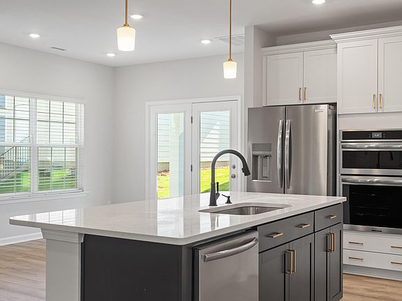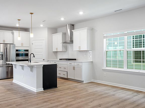 Scenic views overlooking the retention pond from your rocking chair front porch and covered balcony off the second floor primary suite! The open-concept main floor has a living area with a striking fireplace, space for a large farmhouse table or extending living area, a cozy dining nook and an oversized island for additional seating. The gourmet kitchen features a 5-burner gas cooktop, wall ovens including convection microwave, stainless appliances, elegant tile accents, and sleek finishes. Premium luxury vinyl plank flooring and two sets of wood-tread stairs complete the look. On the second floor, find three generous bedrooms and a centrally located laundry room and hall bath. The primary suite features a boxed ceiling and large covered porch with serene water views. The third floor offers a spacious bonus room with ample closet space, perfect for a retreat, media lounge, or guest space. Rear covered porch with ceiling fan extends your living space outdoors, ideal for morning coffees or evening relaxation. Enjoy the added convenience of a tankless water heater for endless hot water. Stainless-steel refrigerator, washer/dryer, and 2' cordless faux wooden blinds INCLUDED on this Quick Move In Home!