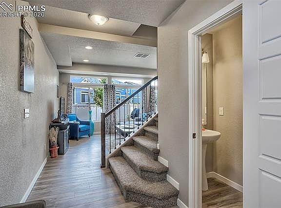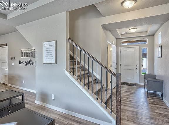 Absolutely amazing home in Banning Lewis Ranch master planned community! Home shows like a model! Why wait to build when you can have a new home now! Upgraded Kitchen Cabinets/w hardware, upgraded soft close cabinets & drawers, upgraded thick granite counters & quarts island, upgraded subway tile back splash, stainless steel upgraded appliances, Upgraded Engineered Vinyl Plank flooring on the entire main floor, Upgraded clerestory window package, Upgraded open wrought iron hand railing, upgraded carpet & pad through out home & rooftop deck with Pikes Peak & Cheyenne Mountain views, upgraded master bath w/poured pan shower! Upgraded back yard landscaping with turf grass & custom fire pit!