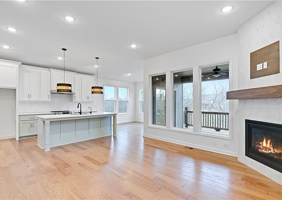 See yourself living in this stunning 4-bedroom, 3-bathroom reverse 1.5 story residence backing to HOA-owned greenspace! Watch the beautiful midwestern sunrise from your covered composite deck.. Light and airy inside, this home gives a sense of tranquility and ease from the moment you walk in. Enjoy the elegance of a floor-to-ceiling porcelain gas fireplace with a wood mantle. The kitchen is a chef's paradise with a stunning herringbone ceramic tile backsplash, white 42" shaker cabinets with tasteful light gold accents, and stainless steel appliances. It features a blanco sink, a reverse osmosis water filtration system under the sink for pristine water, and a large quartz island perfect for entertaining. The full pantry includes a designated space for a wine or mini fridge. Upon entering from the three-car garage, you'll find built-ins in the mudroom. The open-concept Kitchen and Living Room area are enhanced by high ceilings and numerous windows, creating an inviting space to be enjoyed. The main level features the primary bedroom with a vaulted ceiling, alongside the luxurious primary bathroom including a double vanity, a floor-to-ceiling ceramic tile shower, and a spacious walk-in closet. A second bedroom, bathroom, and full laundry room are also on the main level. Venture downstairs to the finished walkout basement where two additional bedrooms await, offering plenty of space for family or guests. This area walks out to an extra-large patio covered by the deck above, perfect for seamless indoor-outdoor living. The basement is also prepped with plumbing stubbed for a potential 1/2 bath. A water softener is included for added comfort.