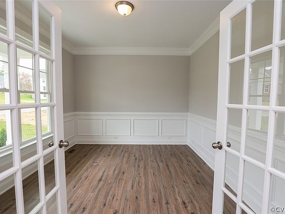 - Description: Glass French doors, transom, molding/wainscotting