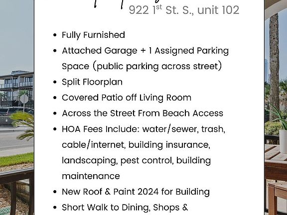 Here's your chance to own a rare ground-floor condo with an attached garage, just steps from the ocean. With modern finishes, coastal-inspired décor, and plantation shutters on every window. This 2 bedroom, 2 bath, split floorplan home offers the perfect blend of style and functionality PLUS is offered fully furnished!