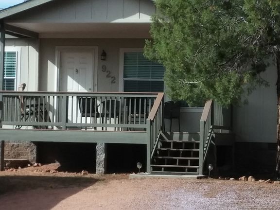 3 Bedroom, 2 bath 2006 Manufactured home, set on cement footings with aircraft anchoring. Cement board exterior siding. Decorative block foundation. Electric and Gas Central Air conditioning and Heating. 23'X10' attached deck built 2008. Detached 22'X18" Garage built 2011. Open floor. Large parking area in front.