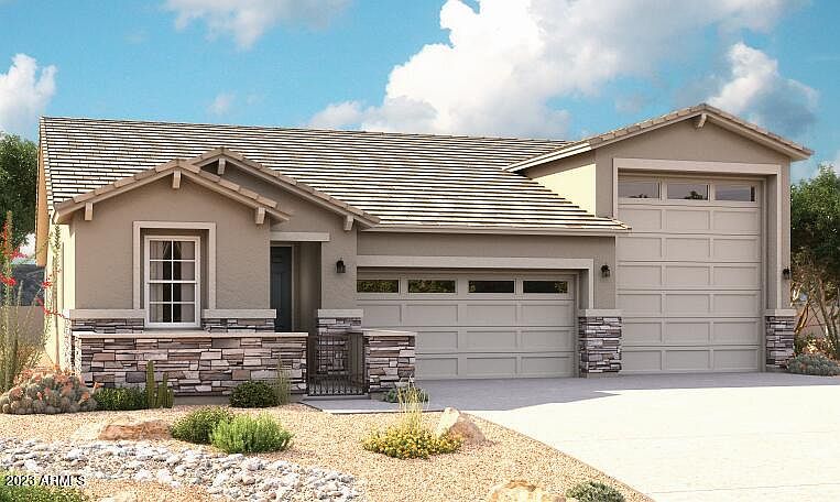 Explore this stunning Pewter home, ready for quick move-in! Included features: a covered entry; a thoughtfully designed kitchen boasting 42'' upper cabinets, quartz countertops, stainless-steel appliances, a center island and a roomy walk-in pantry; an open dining nook; an elegant great room; a lavish primary suite showcasing a walk-in closet and a private bath; a central laundry; two secondary bedrooms with a shared bath; a cheerful covered patio; a 2-car garage and an attached RV garage. This home also offers 18'' x 18'' stone tile flooring, cultured marble bath countertops, ceiling fan prewiring in select rooms, coach lights, front yard landscaping and concrete pavers at the driveway and walkway. Tour today!