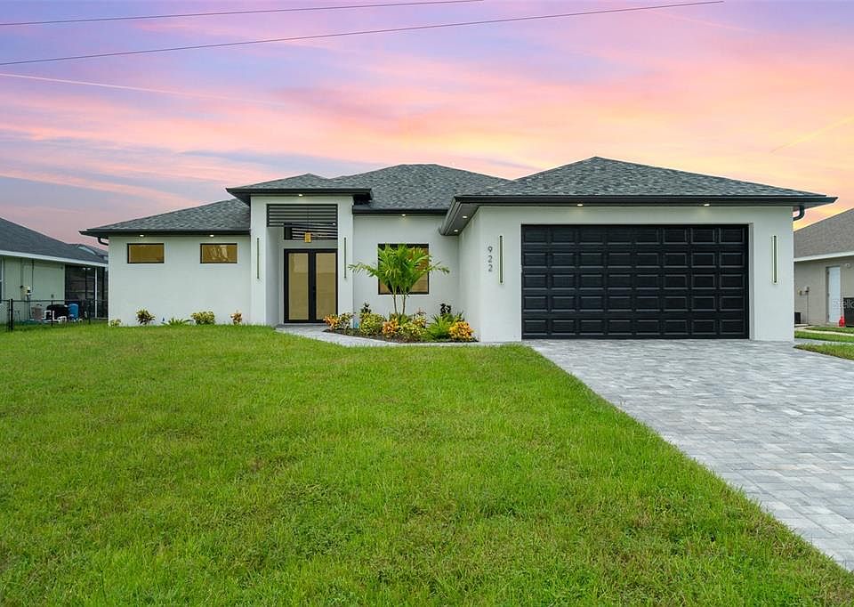Welcome home to this amazing new construction oasis with 4 bedrooms, 3 bath and 2 car garage pool home on a canal in Cape Coral! This new construction home offers great attention to detail, quality, style and exquisite touches!!! This waterfront pool home is just beautiful and stands out because of the colors, hardware, stone work, custom walls and all of the plentiful upgrades. The custom builder designed this home with all the bells and whistles. From the first impression and the curb appeal, this stylish home offers luxurious touches. Entering the home, you are welcomed from the foyer into an open living space and high trey ceilings. There are tan plank tiles throughout the flooring of the home, a fireplace wall with wood surround, and a stunning chefs’ kitchen with waterfall quartz island and views that showcase the pool and canal. The fourth bedroom was designed to be easily converted to an office with it's double doors and built in shelving.The kitchen has 42’ white wood cabinets. All high end LG stainless steel appliances have hideaway outlets and phone chargers. All windows, sliders and doors are impact resistant. Large primary bedroom offers 2 walk-in closets with an attached, enormous custom bath. The spa-like bath has double sinks with quartz counters and a shower that has to be seen to be believed. The home also has 3 additional bedrooms, 2 with walk in closets. The two additional baths (one also being a pool bath) are also beautifully designed to satisfy the most discerning buyer. Even the laundry room has a quartz sink and is fully complemented with cabinets. Outside is an entertainer’s dream!! Beautiful pool with sun shelf, large covered seating area, custom built in outdoor kitchen with grill, sink and refrigerator, enormous poolside lounge area all encompassed by a caged lanai with large picture window screens overlooking your beautiful canal view. Peaceful water views and yet so convenient to shops and restaurants. Flood zone X- NO flood insurance required.