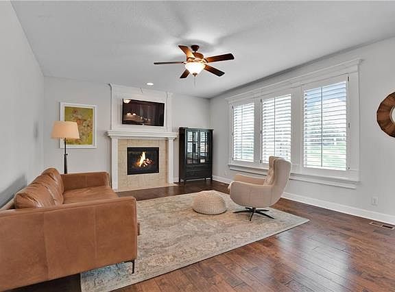 STUNNING IN HIGHLY DESIRED HIGHLAND MEADOWS! THIS ONE IS FULLY LOADED AND BETTER THAN NEW: Beautiful wood floors and plantation shutters throughout main level. Kitchen features designed stone counters and island, backsplash, built-in beverage fridge, pantry and stainless appliances. Family room w fireplace. Formal dining room. Master bedroom includes walk in closet and private bathroom with double vanity and jacuzzi tub. HUGE patio with fire pit overlooks private yard! Walking distance to Longview Lake. HURRY IN! SELLERS HAVE INVESTED MUCH IN THIS HOME AND IT SHOWS. THIS IS A PERFECT 10.