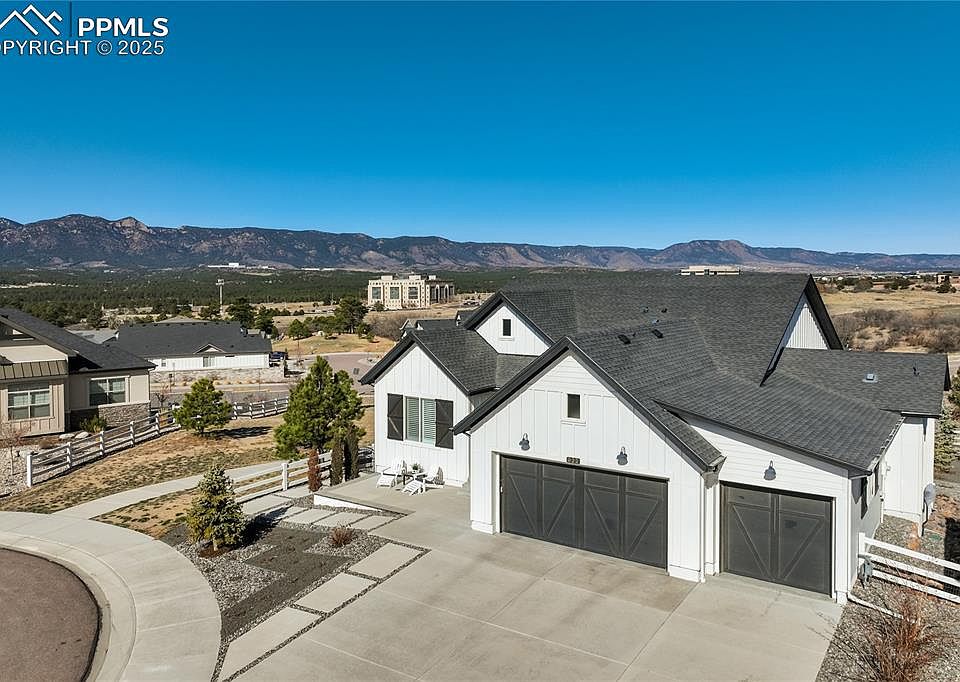 This exceptional modern farmhouse, masterfully crafted by Saddletree Homes, seamlessly blends timeless elegance with contemporary innovation, offering an unparalleled living experience. Perched on a .24 Acre Executive Lot, this home showcases breathtaking panoramic views of Pikes Peak/Mountain Range + the Air Force Academy while backing to community open space + trails. The open-concept design is both sophisticated and inviting, featuring 12’ ceilings in the great room, luxury vinyl plank flooring + floor-to-ceiling windows that flood the home with natural light. The gourmet kitchen is a chef’s dream, boasting leathered granite countertops, floor-to-ceiling cabinetry, under-cabinet lighting, and choice stainless steel appliances, including a 6-burner gas cooktop. The primary suite is a sanctuary, offering spectacular views, integrated speakers, a spa-inspired ensuite with a frameless walk-in shower, dual vanities, and a spacious walk-in closet with direct laundry access. Two additional main-level bedrooms include a private junior suite and a third bedroom with custom shutters. The walkout lower level is an entertainer’s dream, complete with 9’ ceilings, a spacious rec room, gaming/lounge area, integrated surround sound, and a covered patio with a built-in gas grill, hot tub, and fire pit. Two additional bedrooms, a full bath, and a pre-plumbed future wet bar space complete this level. Additional highlights: 8' Doors on the Main Level w/10-12' Ceilings, 3-car Finished Garage w/Coated Floors + Cabinetry, Motorized Hunter Douglas Blinds, Electronic Patio Shades, Control4 Smart Home System, Energy Efficient HVAC System + WiFi Enabled Efficient Hot Water Heater. Enjoy all that The Farm has to offer—food truck events, parks, trails, and access to The Gathering Place clubhouse, pool, and fitness center. With award-winning D20 schools and easy access to I-25, this home is a rare opportunity to embrace luxury, comfort and Colorado’s stunning natural beauty.
