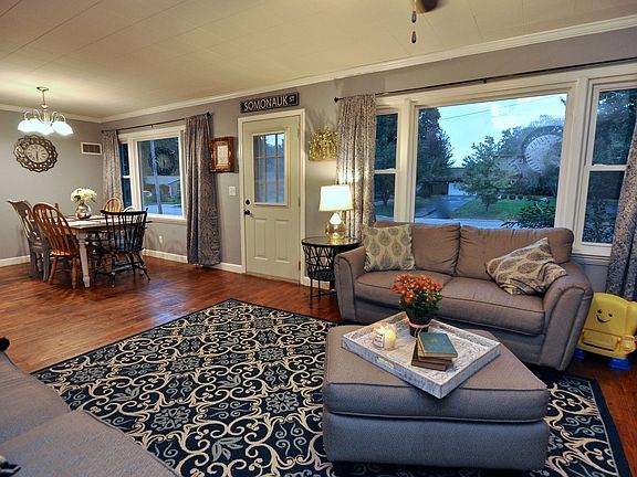 CHARMING HOME WITH "POTTERY BARN" APPEAL SHOWCASES HARDWOOD FLOORS, CROWN HOLDING, WHITE TRIM & DOORS & GRAY WALL COLOR SCHEMES! Architectural roof shingles, beveled vinyl siding, storm door, entry door w/ built-in blinds, concrete drive, 20'x5' breezeway, patio, bonus shed & fenced-in backyard complete the exterior & outdoor retreat! Sun filled Dining Room & Living Room present chandelier, crown molding, picture windows & custom bookshelves that secretly open into hidden linen/pantry closet! Kitchen boasts stainless steel appliances, tin backsplash, corner niche shelving, entry wall hooks, 5 burner gas range, convection oven & "quick grab" frig opener for energy efficiency/convenience. Bath presents gorgeous vanity, free floating shelving, porcelain tiled flooring & decorative mirror. Extra wide closet accommodates the Master Bedroom. Hardwood floors, window shades & ceiling light fans in all bedrooms. New A/C, basement lookout windows w/ exterior access, washer/dryer/freezer!