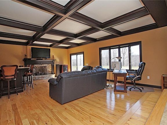 Imagine owning a private retreat on 24+ acres w/manicured entrance as you wind through 1100 ft long concrete drive passing 2 of 4 gleaming stocked ponds, open fields & hideaway paths to enjoy your own nature preserve. Entertain in style indoors or enjoy BBQ's from rear paver patio & panoramic views of pond for swimming, complete w/dock. This custom built brick & stone spacious home is a chef's delight w/light filled larger kitchen renovated in 2011 to include upgraded appliances, custom built cabinets, granite counters, travertine back-splash & ceramic tile floors, dbl sinks & ovens & built-in wine cooler. Open design flows to great rm or formal dining makes for easy entertaining. You'll love the hickory wood floors flowing through most of main floor to great room, living rm, dining rm & library/office. Relaxing in the great rm is easy w/gas fireplace, wet bar & coiffured ceilings. An expansive owners suite w/15x16 spabath soaking tub, 12x8 closet & built-ins is hard to leave. All 3 full baths are tiled. Everyone will love the finished basement w/areas for billiard or home movie theater & another bar. Plenty of space for the toys in the propane gas heated 32x70 finished barn w/double overhangs, concrete floor, upper loft partially fin. w/drywall, cabinets & htr. With acres of cleared, level land the potential for more outbuildings, pastures or family compound just need your imagination to complete your dream. Add'l land available. Feel the magic & live life to the fullest.