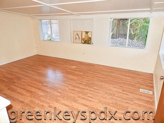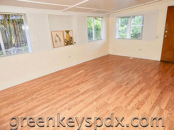 Unique 3-Bedroom Duplex with front porch, perched above SW Capitol Hwy Clean and move-in ready! This unit was built in 1954 by a ship captain! It features: * Freshly painted throughout * Scratch resistant laminate flooring in living room * Large kitchen * Washer and dryer in unit * From living room, step up into an area for dining or lounging * Large bedroom with 2 closets overlooks side yard * Other two bedrooms overlook the large backyard * Bathroom features tub/shower combo Great location near Multnomah Village, a pedestrian path and a bike path. Walk to Barbur World Foods. Hike in nearby Woods Memorial Natural Area and Spring Garden Park. Located south of Gabriel Park. Walk to 2 different bus stops, close to the Barbur Transit Center. Easy access to I-5, either North or South. Utilities: Owner pays garbage. Tenants pay for gas, electricity and the unit's fair share of the complex's water-sewer bill (billed to tenants quarterly, and you get a copy of the bill from the Portland Water Bureau to view usage). This property is managed by Green Keys Property Management LLC. The first step is to take the video tour. Just go to the website of Green Keys PDX and click on the Our Listings tab. Find the photo of this place on SW Capitol Hwy and then click on the blue Video Tour button. Application period is open. Application fee: $45 per adult Move-in Costs: First month's rent plus a refundable security deposit that is $40 to $60 less than rent Lease: 12 months, renewable if rent is paid on time. No Smoking. Pet policy: 1 or 2 cats allowed with owner approval and $30 pet rent and $250 pet deposit. We are looking for applicants who can start a lease sooner rather than later. Lease: 12 months, renewable if rent is paid on time.
