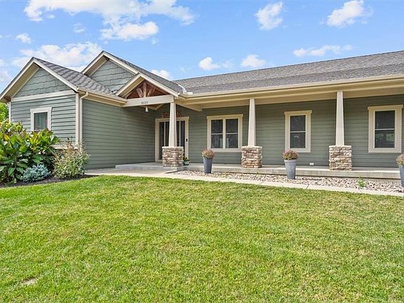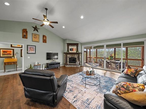 Enjoy picturesque country living on 1.92 Acres in the JoCo! Custom Reverse 1.5 Story built in 2016! Executive Home where large gatherings are possible! Start your day on the 25' x 16' private, screened deck/sunroom while viewing wildlife & your 1/3 Acre stocked pond! You will see deer, foxes, birds, blue herons, geese, ducks, and raccoons! This home is an entertainer's dream with a big open chef's "kitchen/living room combo"! The kitchen leads to a grilling deck with gas supply from the home! The main floor living area features a huge "beautiful ballroom feel" living/entertaining area with 14' ceilings. The master bedroom/bath walks out to the 3rd deck area. A second bedroom on main level with a full bath in hallway. There is a mudroom off of the garage with a desk area. Laundry room off the kitchen on the main level!