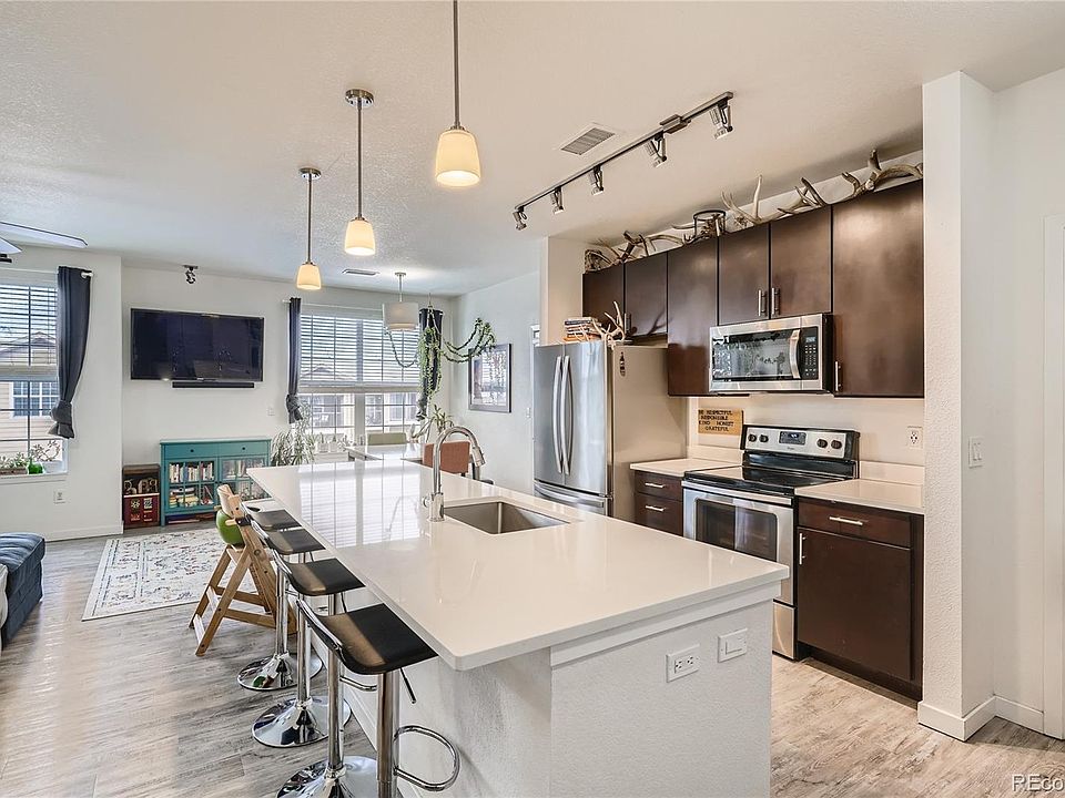 Fantastic condo to call home! Live large with loads of natural light, vaulted ceilings, spacious, open floor plan. Beautiful kitchen with white quartz countertops and stainless steel appliances. The Master suite has a huge private bath and walk-in closet. 2nd and 3rd bedrooms share a large, full bath. Located close to E470 for easy commutes. Lovely walking path connects to Open Space Park. Friendly neighborhood, great schools, community pool, playground, park, fitness center. So much to love.