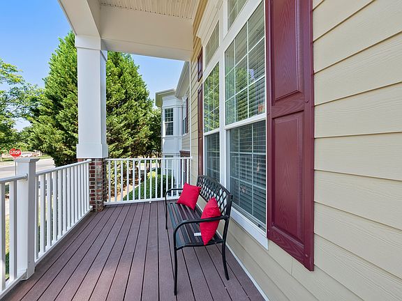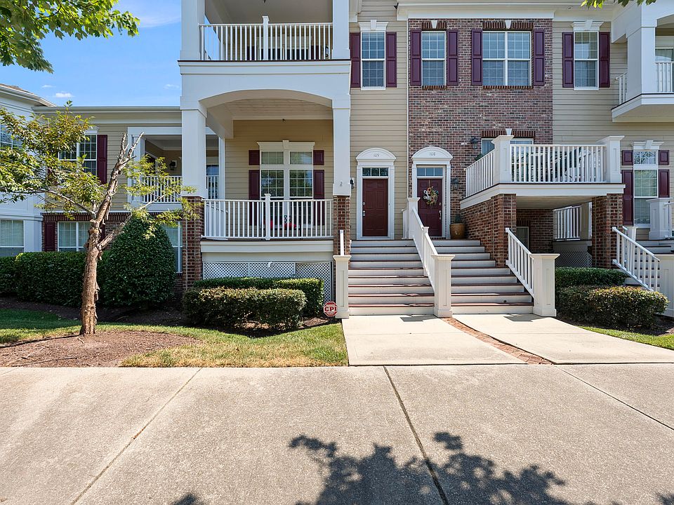 Welcome home to The Cottages at Brier Creek, an upscale townhome community minutes to shopping, RDU, Rex/Duke/UNC and highways. This 3 bedroom 2.5 bath townhome lives large. Light and bright with windows galore. Enjoy overlooking the tree lined streets from one of 2 expansive porches! The great room boasts wood floors and gas fireplace with cathedral ceiling. The kitchen and dining area is truly a place to entertain. 42 inch cabinets, solid surface countertops and TONS of work space. The third floor features the primary bedroom with massive w oversized walk in closet, en-suite tiled bath with both tub and shower. Enjoy the private deck day or night. This unit offers a 2 car garage with extra storage. Fresh paint throughout and New carpet. This quaint community offers private pool, workout facility and grilling area for residents.