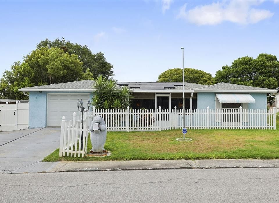 NEW EXCITING PRICE!!! Don't miss out on a home that has so much to offer. Take full advantage of the benefits of the paid off Solar Panels here on this single family pool home. The land here is high and dry in a non-flood zone. Relax in your oversized fully screened in foyer patio. With just under 1,500 sq feet of living space this open floor plan offers plenty of room to spread out. Your kitchen is fully equipped with newer stainless steel appliances and granite island with custom design floor tile. You will love the gorgeous French doors in the large primary leading to the sparkling pool in your private fully fenced-in backyard which includes a dog run located behind the pool. The jack-and-jill bathroom serves the primary and as a 2nd bathroom for the home. The second bedroom is generously sized and has stained glass closet doors. No worries with the washer and dryer included in the single car garage. Local to restaurants, shopping and parks. 2 minute drive to the local neighborhood 11 acre Lake Lisa Park with walking trails, playground, charcoal grills, and fitness stations. 5 minute drive to Werner-Boyce Salt Springs State Park where you can enjoy hiking, fishing, kayaking, or camping. 10 minute drive to Downtown New Port Richey. 35 minute drive to Tampa International Airport. This home was loved for and cared for by the sellers so don't miss out and book your appointment today.