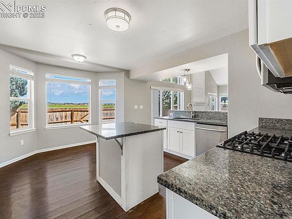 Welcome to this beautifully updated 2-story home, where modern elegance and spaciousness combine to create a truly inviting living space. Tucked away in a serene location with no neighbors behind, this residence offers the perfect balance of privacy and convenience. As you step inside, you'll be greeted by stunning laminate wood floors that lead you through an open and well-designed floor plan. The main area off the entryway provides versatility, offering ample space for a formal dining room and living room or the option to create a generous dining area adjacent to the kitchen. The heart of the home is the impressive great room, bathed in natural light pouring in from large windows, accentuating the vaulted ceilings that add an element of grandeur. Cozy up next to the wood-burning fireplace on chilly evenings or step outside through the convenient walk-out to the patio, where you can enjoy the refreshing outdoor ambiance. Prepare meals with pleasure in the updated eat-in kitchen featuring newer cabinets, sleek stainless steel appliances, a gas range for the chef at heart, and elegant granite countertops. The breakfast bar overlooking the great room creates a seamless flow for entertaining, while the kitchen island and abundant cabinet space make organization a breeze. On the main level, you'll find a versatile bedroom with French doors and an adjoining bath, providing flexibility for an office space or a hobby/play area. Escape to the master suite with vaulted ceilings, walk-in closet, and a luxurious 5-piece bath. Upstairs overlooks the great room, 2 more bedrooms, and upgraded bathroom. The basement is a fantastic space for entertainment, featuring a generously-sized rec room area with a dry bar, ideal for hosting gatherings and creating cherished memories plus it has an extra bedroom, and bathroom. Enjoy the fenced backyard with mountain views. Close to Peterson SFB, Fort Carson, Schriever SFB, and more. Don't miss out on this one. Schedule a tour today!