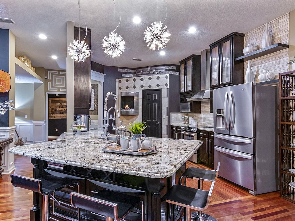 Beautifully renovated 4/2 backed up to a preserve on a quiet cul-de-sac in a great neighborhood with shopping and dining galore just a mile away! All the amenities you need with low HOA and no CDD fees! Kitchen features 42'' cabinets, stainless appliances (Brand new refrigerator and dishwasher), deep sink with industrial style sprayer faucet, granite countertops with huge peninsula/eating area. Open living room / dining room layout with 10' ceilings and huge built-in for TV, decor, and ample storage. Brazilian cherry hardwood floors in kitchen, living, and dining rooms. French doors open to back patio. Master bedroom has laminate floors, feature wall, tray ceiling, and bay window. Master bath has wood-look tile floor, marble countertop with vessel sinks and tile backsplash. Glass subway...