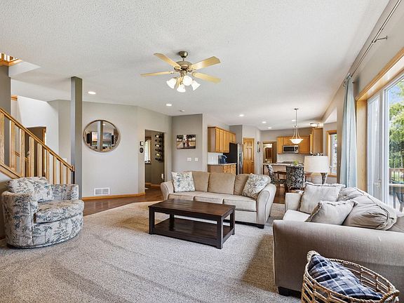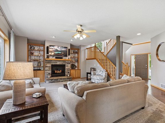 Stunning former model home in prime location, nestled on a side-walkout lot in a serene cul-de-sac. The striking stone exterior & inviting wraparound porch enhance its impressive curb appeal. Inside, the open floor plan features beautiful hardwood floors on the main level, formal dining, a spacious kitchen with granite countertops, a subway tile backsplash, stainless steel appliances & pantry. The living room boasts a cozy fireplace surrounded by built-ins. The upper level offers 4 bedrooms, each w/walk-in closets. The primary bedroom offers vaulted ceiling, beautiful bathroom, spacious walk-in closet w/organizer system. The finished lower level is perfect for entertaining, offering a large family room with media center, wet bar, bedroom & bath. Some additional features include recently updated carpeting on the main & upper level. Fenced-in backyard & adorable chicken coop. Heated garage w/electric car charging outlet & epoxy flooring. Close to parks, trails, shopping and more!