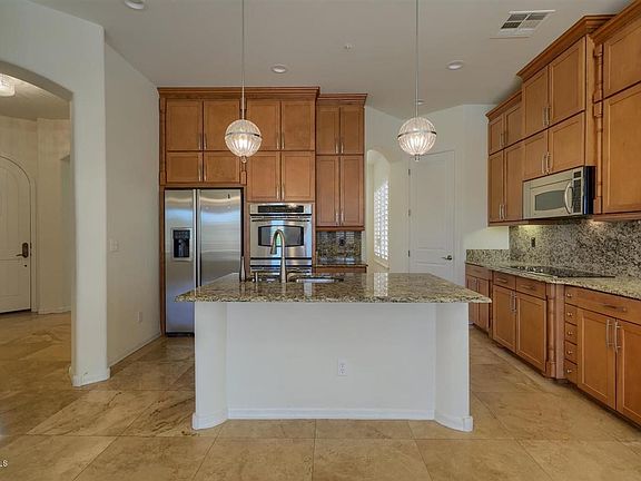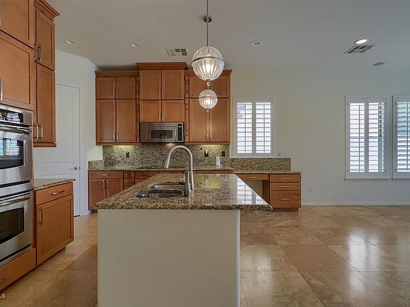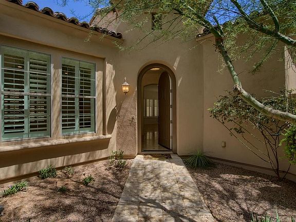 This beautiful single level home is ideally located in a gated community on a premium lot across from one of the neighborhood parks. The popular split flooplan features Granite counters & backsplash, upgraded shaker cabinets w/brushed nickle hardware, stainless steel appliances, double convection ovens and pendant lighting in the kitchen. Outside you'll find Mountain views from the extended paver patio, built in Gas BBQ, Firepit, 3-tier fountain, planter and a large sitting area. The Great room features a gas fireplace with beautiful tile surround. The master bath has Granite counters, jetted tub, frameless shower and walk-in cedar closet. Easy to maintain Travertine flooring, updated lighting, fans and Plantation shutters are found throughout the home & epoxy in garage. DC Ranch.. has two community centers, pools, playgrounds, fitness center, tennis, basketball and pickleball courts, paved walking and hiking trails a community garden and many social clubs. DC Ranch Crossing shopping and dining is a short walk from the home and other fine restaurants and shopping can be found just down the street at Market Street. Please see the Documents tab for a full list of upgrades found in the home.