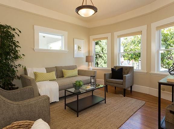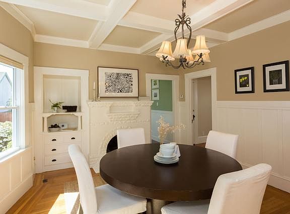 Sweet NOBE bungalow with traditional details, box-beamed ceilings, built-ins, hardwood floor, and decorative fireplace. Two car parking. Sunny backyard with deck. Partial basement.