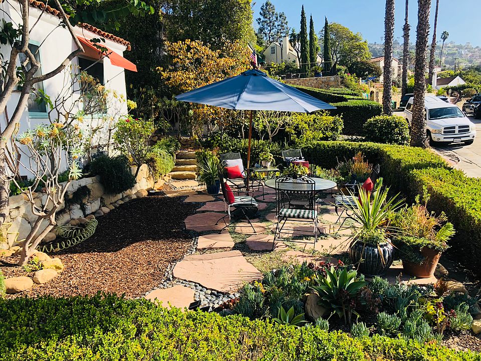 Nestled above the street, this charming Spanish style 2 bedroom 1 bathroom home plus a detached studio with a full bathroom offers privacy, natural sunlight, ocean views, a variety of fruit trees, as well as multiple decks for relaxing and/or dining. Hand cut old world sand stone walls and an arched entry escorts you up to the entry where one of 4 patios and decks awaits above the one car garage. From here you can soak up the gorgeous sunsets and even walk to the famous Santa Barbara Bowl and hear live music. Another authentic touch to this home are the original bay windows that have been restored and offer natural sunlight and multiple views of the ocean and city. The custom designed open floor plan maximizes space and provides excellent space from room to room. The open concept design combines the kitchen and living space into a great room that?s perfect for relaxed entertainment. The dining room offers a custom Nano wall door system which allow the walls to open completely and seamlessly to the outdoors, creating an inviting space for indoor/outdoor living. The remodeled gourmet kitchen boasts an array of amenities- including commercial grade appliances, striking custom solid wood cabinets, and a custom sand stone island providing a sitting area, dining area and extra space for cooking. Outside you will find a lovely flag stone patio featuring a reflexology cobble stone walking path promotes relaxation and a perfect area to sit back and relax. Surrounded by a wide variety of fruit trees, multiple sitting areas and all offering the view of the beautiful home and ocean. A detached guest studio with a 1/2 bathroom awaits in the back yard amidst the fruit trees and offers privacy from the main house. Over all the property features a classic low level red tile roof and coast line views plus close proximity to downtown making it easy to partake in many options of dining, shopping and entertainment. Tenants pay for all utilities. Owner pays for the gardener/landscaper.