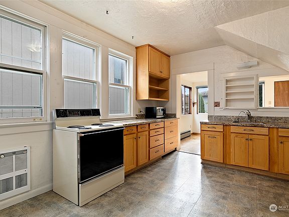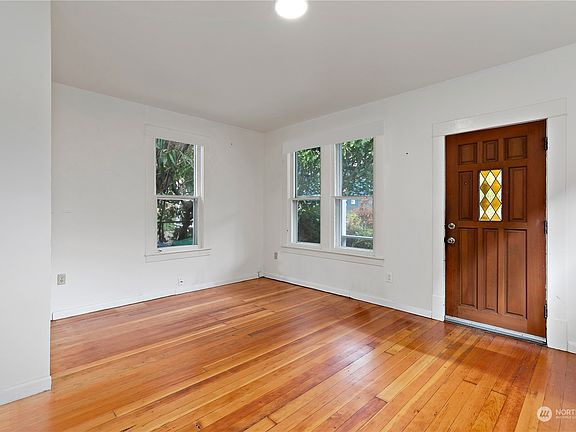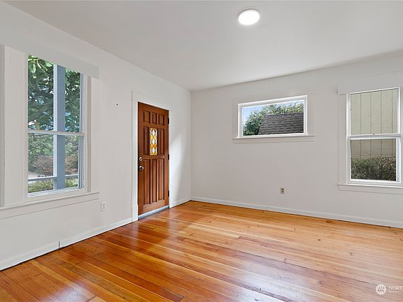 This sweet 1916 Greenwood home with inviting covered front porch is brimming with potential. Beautiful front garden with a fig tree and established raspberries vines in back. Rich fir floors in the living room lead back to a generous eat-in kitchen and rear sun room. Full bath on main. Upstairs ½ story offers a primary bedroom with territorial views to the south and a charming bonus room leading to the front bedroom. Detached basement provides plentiful storage for all your outdoor gear. Located just a short distance from Greenwood's vibrant shopping and dining district and top-rated schools, and an easy distance to Green Lake. This home offers both a convenient location and the potential to build equity.