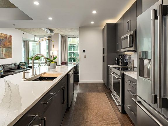 Gorgeous renovation! The floorplan has been altered which makes it a truly original unit. Kitchen features Cambria Britannica waterfall countertop, Moda 5 Modern cabinetry, Kallista faucet & new appliances. Master bathroom has a dual shower with walk-in frameless shower door, a towel warmer & Kohler fixtures. Second bathroom has a large soaking tub w/a modern glass door, new 5" Oak enginnered hardwood floors in living area. New carpet in both bedrooms and custom closets.