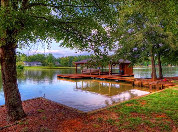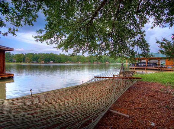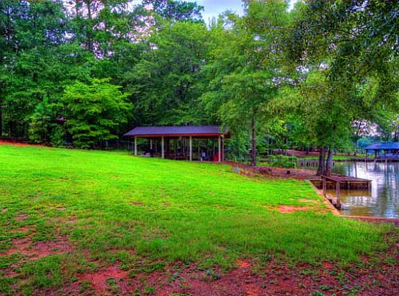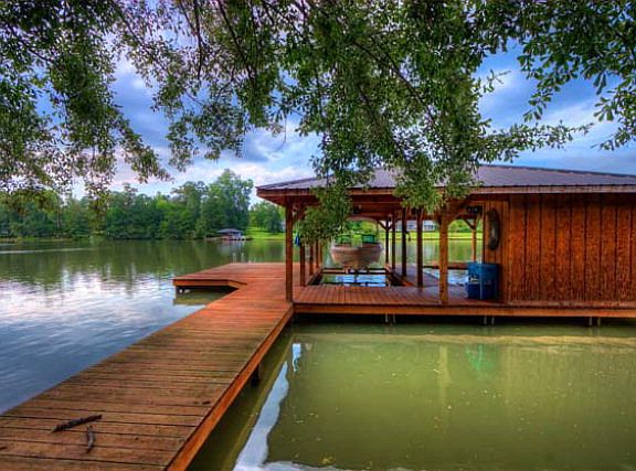 Perfect weekend lake home! With this home, you get it all. A fee simple, gentle sloped, fenced-in lot, with a great view, deep water, off the main river. Magnificent double boat shelter & dock with double boat lifts, fire pit, covered pavilion with concrete floor, and tons of room! On county water, the house has lots of upgrades, open floor plan. Site built addition to this manufactured double wide really opened up the space and allowed 5 bedrooms and 4 baths. Has a double car carport, a fireplace and French doors that open up to a large waterside deck.
