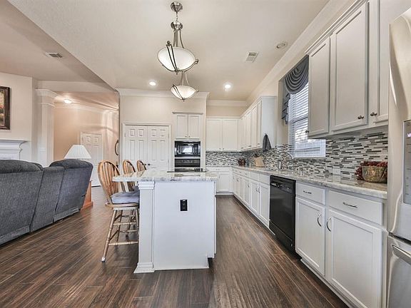Come and tour this beautiful one story home on a cul-de-sac! NEVER FLOODED! Amazing kitchen with upgraded granite countertops, glass mosaic tile backsplash, ample cabinet space, & an over-sized kitchen island with breakfast bar! Wood-grain tile flooring throughout the living areas! Open floor plan with spacious living room that boasts a gas-log fireplace, bay windows & raised ceilings. Enjoy time on the upgraded covered patio with stamped concrete flooring, recessed lights & beautiful flowerbeds. Oversized master bedroom with a spacious closet, jetted bathtub & dual vanities. Dedicated study with built-in executive desk and shelving! This home even features a game room with built-in desk & cabinets! Spacious secondary bedrooms with new carpet & a well maintained hall bathroom. Formal dining room with crown molding. Energy efficient windows throughout! Spacious laundry room & updated powder room. Recent water heater, fence, exterior paint, cooktop & more! CHECK OUT THE 3D VIRTUAL TOUR!
