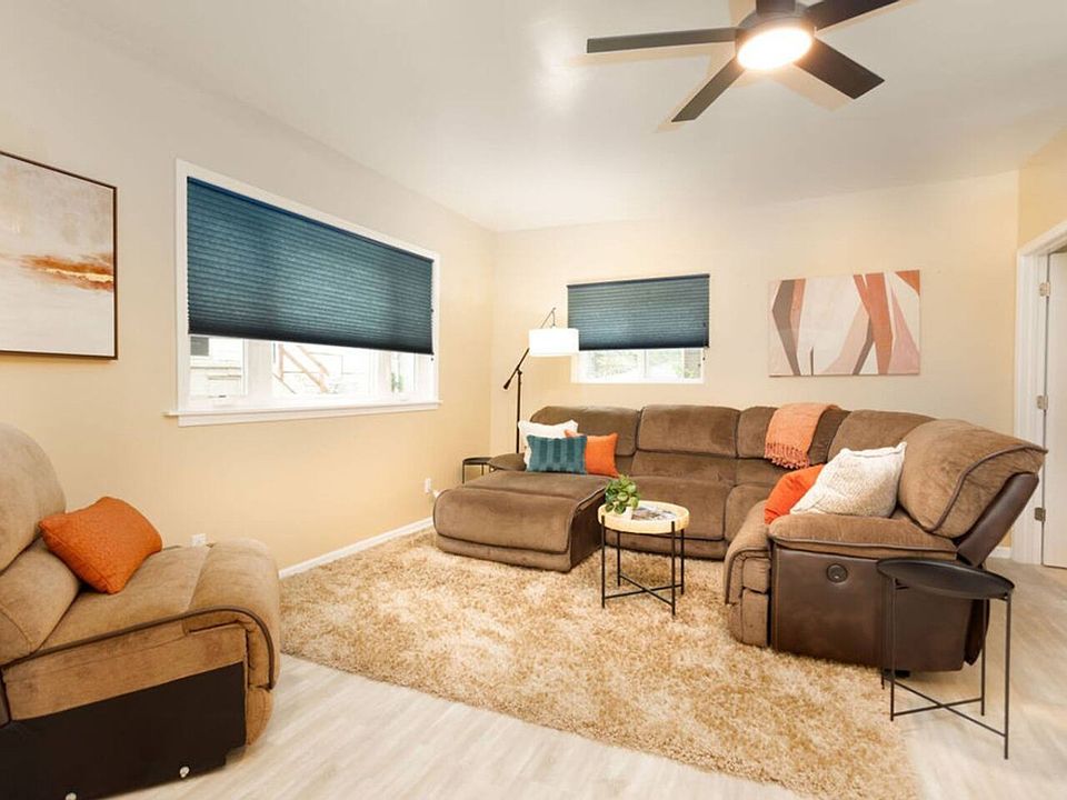 Welcome to your perfect Pittsburgh retreat, ideal for groups of up to 10. Nestled in one of the closest neighborhoods to downtown, this home offers easy access to North Shore, Deutschtown, and the Strip District. Situated on a low-traffic street, you'll be within 5 miles of numerous attractions and medical facilities. Enjoy the privacy and convenience of three bedrooms, each with a full ensuite bathroom, and a fully equipped kitchen with brand-new appliances. A covered deck adds to the charm of this inviting space. Step into the cozy living room through convenient keyless entry and choose from three bedrooms plus additional sleeping spaces. The bright Upstairs Master King Bedroom features a stately king sleigh bed, a large walk-in closet, and an ensuite bathroom with a double-sink vanity and tub/shower combo. A workspace is also available here. The Upstairs Queen Suite offers a comfy queen bed, a walk-in closet, and an ensuite bathroom. Downstairs, the third bedroom includes a queen bed, a twin-size daybed with a twin-trundle bed, and a recliner that fully reclines. The living room sectional and chaise also provide additional sleeping options, along with a queen-size air mattress. Enjoy your favorite entertainment on the 55" Samsung smart TV or relax on the private covered deck with seasonal views of downtown. The fully equipped kitchen boasts all major appliances and handy small appliances, along with ample prep space and all necessary cookware and utensils. Dine at the table for six, supplemented by barstool seating for three. A half-bath and a laundry area with a washer and dryer add to the convenience. Ample street parking is available on the left side of the street when facing uphill. Located in the Northside section of Pittsburgh in the East Allegheny neighborhood, also known as Deutschtown, you'll be in one of the closest neighborhoods to downtown Pittsburgh. The area is bustling with restaurants, bars, grocery and hardware stores, boutiques, and more. Nearby attractions include Acrisure Stadium, North Shore destinations, Rivers Casino, Strip District, PPG Paints Arena, and major medical facilities. Public transportation is easily accessible, with bus stops a short walk away and the North Shore Connector light rail service offering free rides within the Downtown and North Shore zones. Biking and walking are also great options for exploring the city. No parties are allowed, and no pets are permitted. The home shares a wall with an adjacent attached home, so please be mindful of noise. The property is on a steep hill, and a 4WD/AWD vehicle may be desirable in winter weather conditions. Self-check-in is available with a digital keypad. Access to everything in the home is provided except for the locked downstairs bedroom closet and the locked basement storage area. Includes a workspace in the Upstairs Master King Bedroom with a desk and chair, and a vanity with a chair in the Upstairs Queen Suite that doubles as a workspace. Wi-Fi is provided via Verizon FIOS.