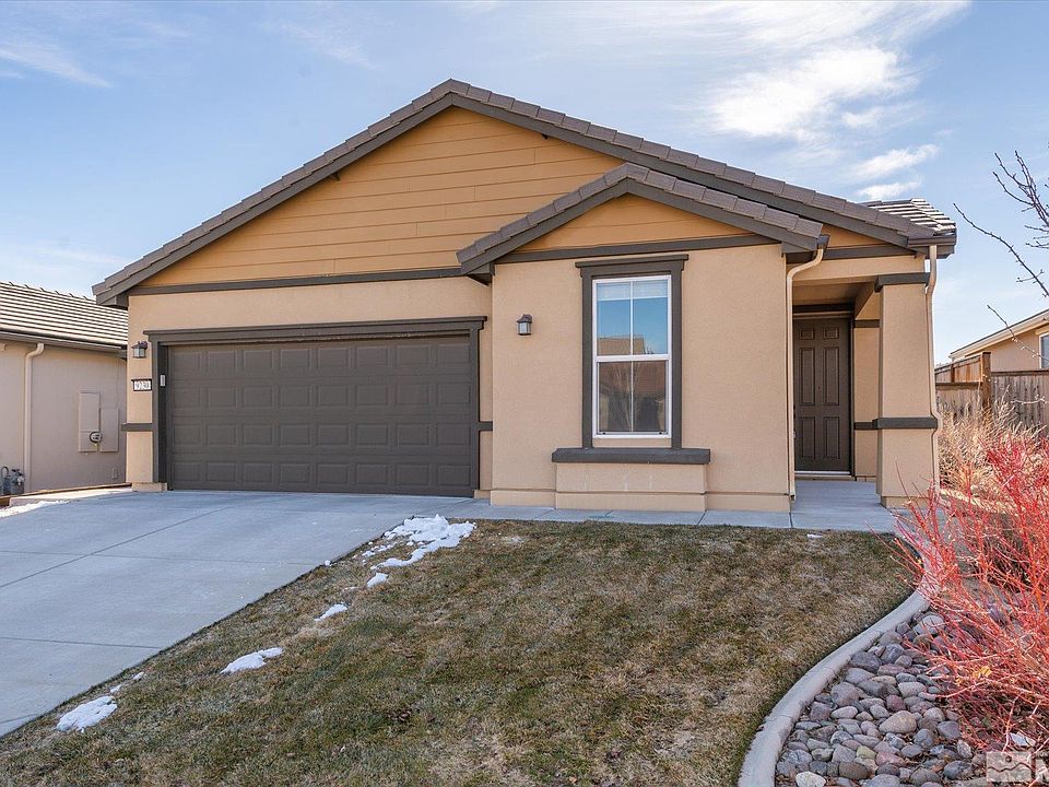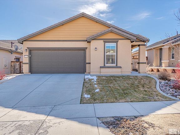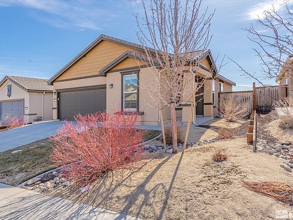 Stunning mountain views! Newer, upgraded Washoe model in Sierra Canyon 55+ community. Built 2015. Open floorplan. Kitchen features nice sized island, granite counters, cherry cabinets w/soft closing drawers & roller trays, pantry and Whirlpool appliances. Great room opens to private backyard with paver patio, low-maintenance xeriscape landscaping, bubbling rock water feature & Carson Range views. Primary bedroom has mountain views, spacious bathroom and walk-in closet. Versatile den/2nd bedroom with closet.