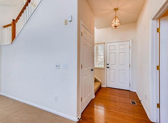 Ready for immediate move in! Tons of upgrades, including hardwood floors in kitchen, cherry cabinets, see-through fireplace separates the huge eat-in kitchen and cozy living room. Upgraded tile and fixtures in all bathrooms, upgraded light fixtures throughout the house. Built in surround sound wiring, security system and wet bar in the basement. Recreation center is situated directly behind the house and across the street. The facility provides indoor and outdoor pools an exercise room and much more. Great location! Woodman Hills Metro District water/sewer fees cover access to two recreation centers.